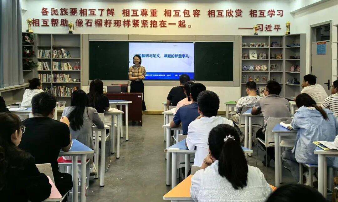 在“石榴籽工作室”里,援疆教师金明君以《说说教研和论文、课题那些事儿》为题,立足教师实际需求,通过前期问卷调查精准定位困惑,将高深的理论转化为可操作的实践路径。她提出“教研不是空中楼阁,而是根植于日常教学的沃土”,强调教学反思、听课评课等常规环节中蕴藏的科研价值。