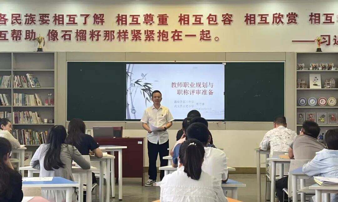 同日,援疆教师邓雪勇以《教师职业规划与职称评审准备》为主题,结合自身经验,从目标设定、政策解读到材料准备,为教师职业发展“把脉开方”。他提出“反向规划”理念,建议教师以职称评审条件为指引,分阶段夯实教学、科研与引领能力。