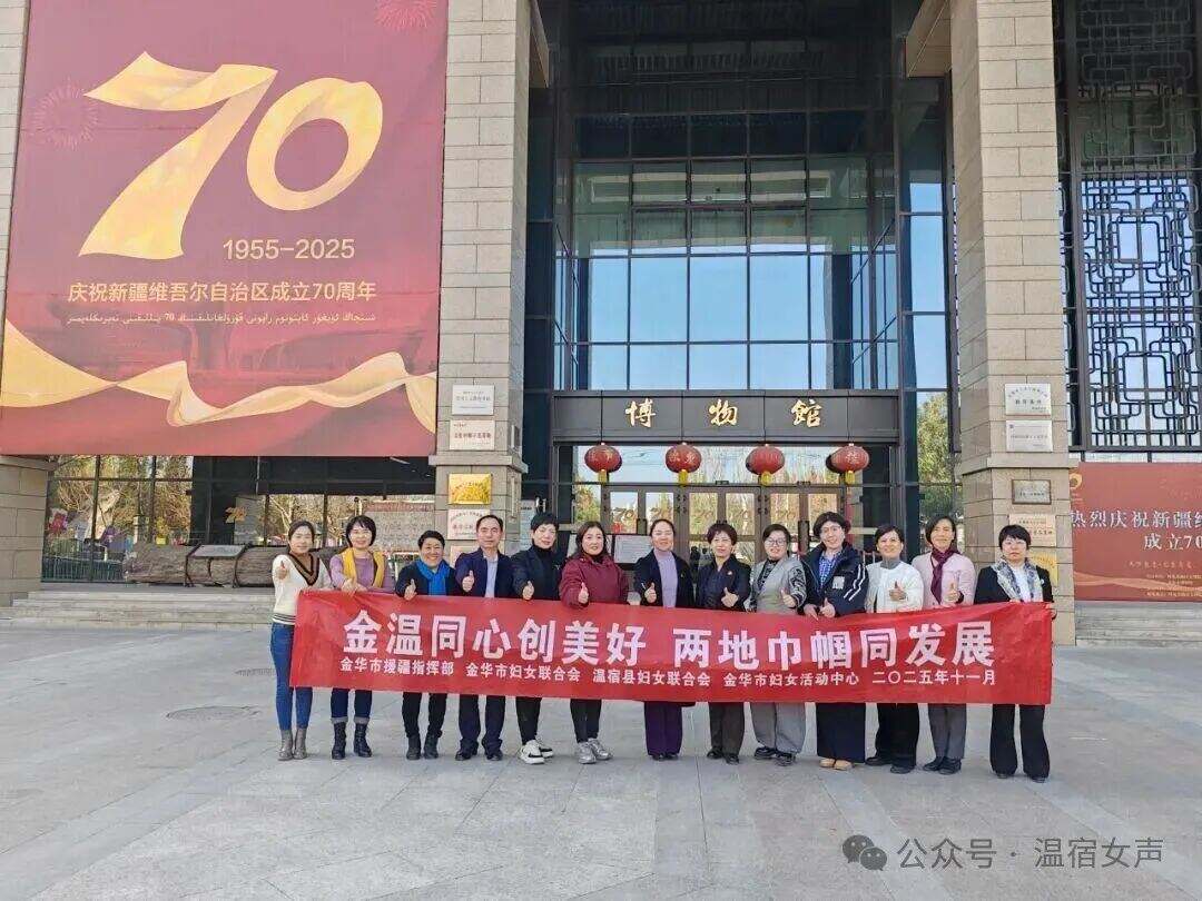11月9日至15日,金华市妇联党组成员、副主席朱玲带队,女企业家、家庭教育讲师、“最美家庭”代表等一行13人赴新疆温宿县开展交流互访,通过实地调研、座谈交流、结对共建、爱心捐赠等形式,架起两地协作桥梁,赋能边疆妇女发展与经济建设。