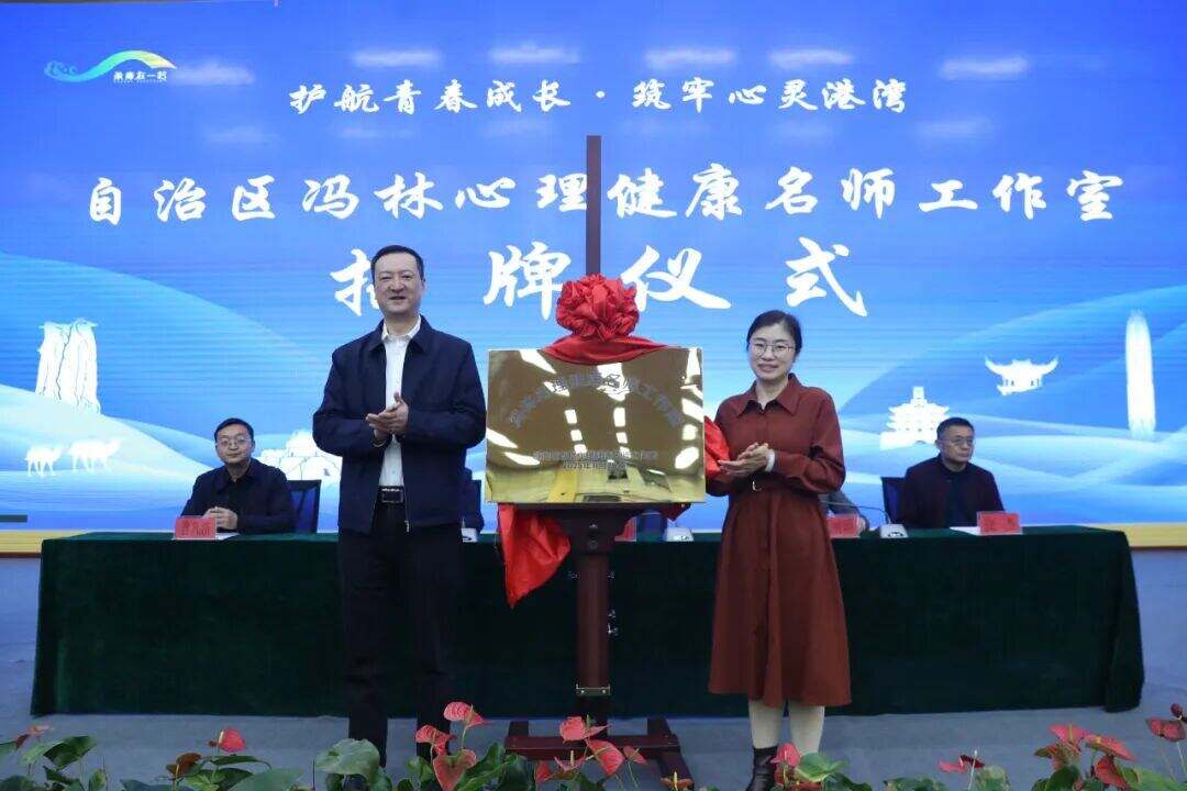 仪式上,杨勇与库车市第二中学心理教师冯林共同为自治区首批心理健康名师工作室揭牌。