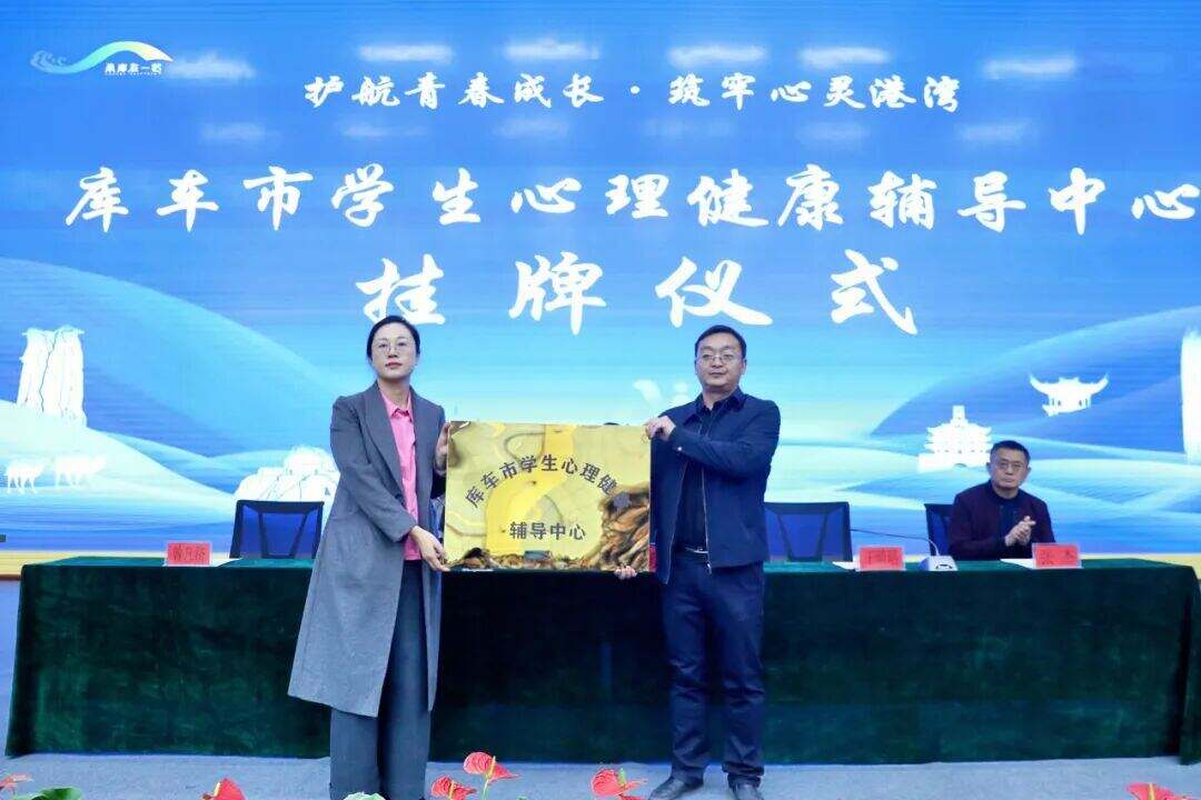库车市委教育工委副书记、教育局党组书记王晴晴与库车市第二中学党委副书记、校长校长曾凡济为库车市学生心理健康辅导中心揭牌。
