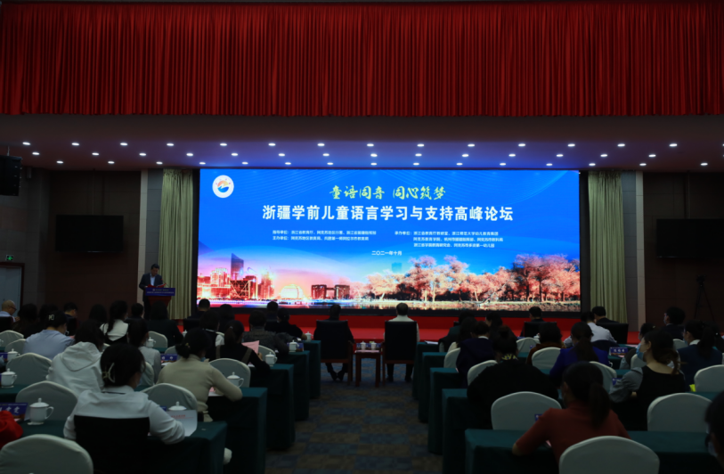 为深入学习贯彻第三次中央新疆工作座谈会和第八次全国对口支援新疆工作会议精神,坚定落实习近平总书记关于国家通用语言文字教育“要从娃娃抓起”的指示精神,进一步加大国家通用语言文字推广力度,巩固提升国家通用语言文字教育教学质量,切实铸牢中华民族共同体意识,10月20日,由浙江省教育厅、阿克苏地区行署和浙江省援疆指挥部指导,阿克苏地区教育局、一师阿拉尔市教育局主办,浙江省教育厅教研室、浙江师范大学幼儿教育集团、阿克苏教育学院、杭州市援疆指挥部、阿克苏市教科局、浙江省学前教育研究会、阿克苏市多浪第一幼儿园等单位承办的“童语同音 同心筑梦”浙疆学前儿童语言学习和支持高峰论坛在阿克苏启动。