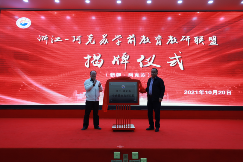 会上,王忠民和包尔汗·买买提共同为“浙江-阿克苏学前教育教研联盟”揭牌;同时揭牌的还有“胡瑛名师工作室”,充分发挥浙派名师的示范引领作用和阿克苏教育学院的师(干)训基地功能。