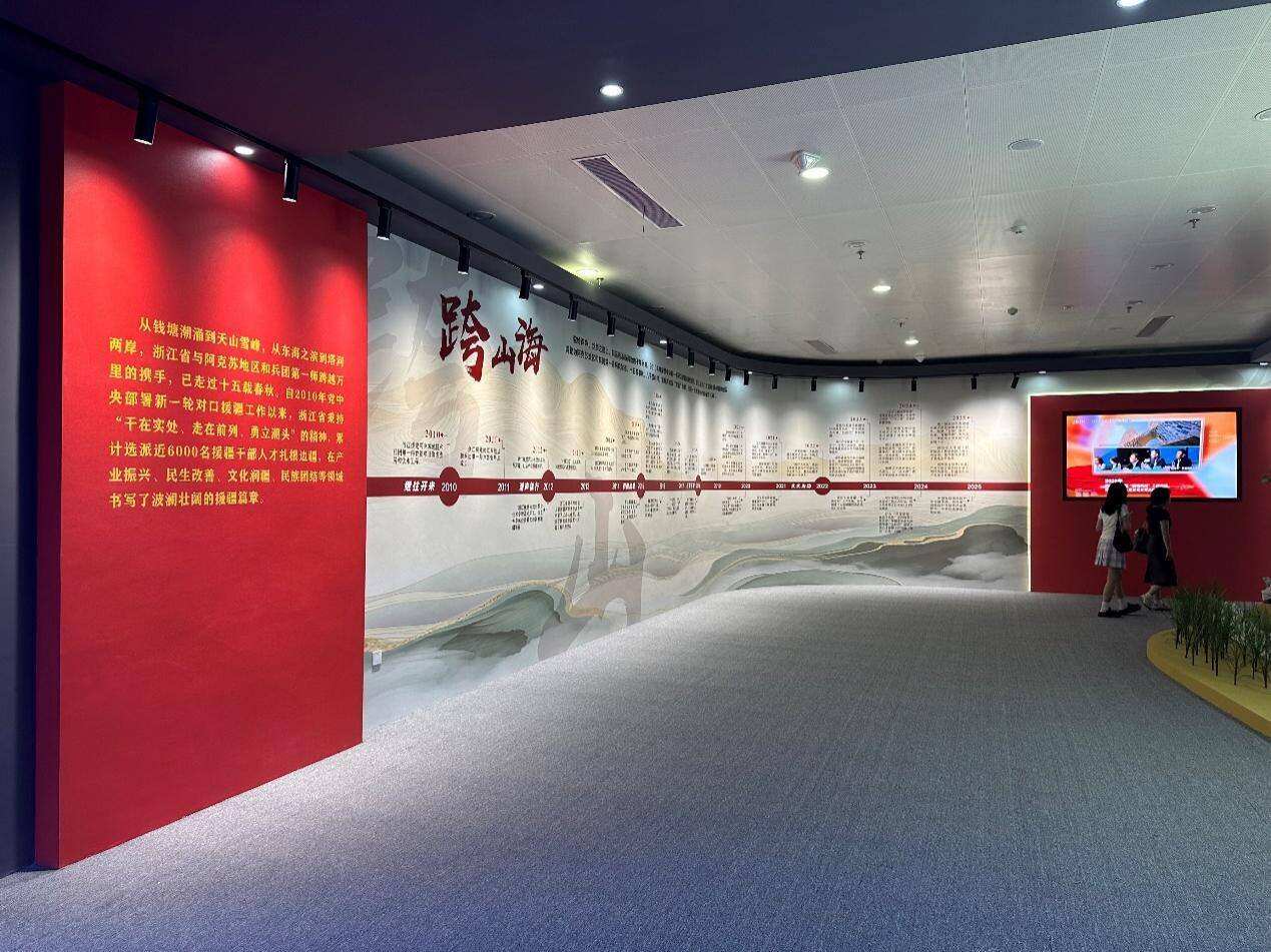 本次展览由浙江省援疆指挥部、浙江日报报业集团和浙江省档案馆联合主办,共分跨山海、筑新业、惠民生、润同心、结深情5个篇章展开。展览以视频、文字、图片、模型、互动等多种形式,生动展现了15年援疆岁月中,浙江在产业振兴、民生改善、文化润疆、民族团结等领域为阿克苏注入跨越山海的温暖力量,绘制出的一幅幅“浙阿一家亲”壮美画卷。