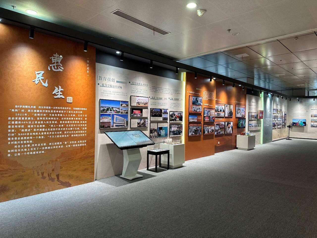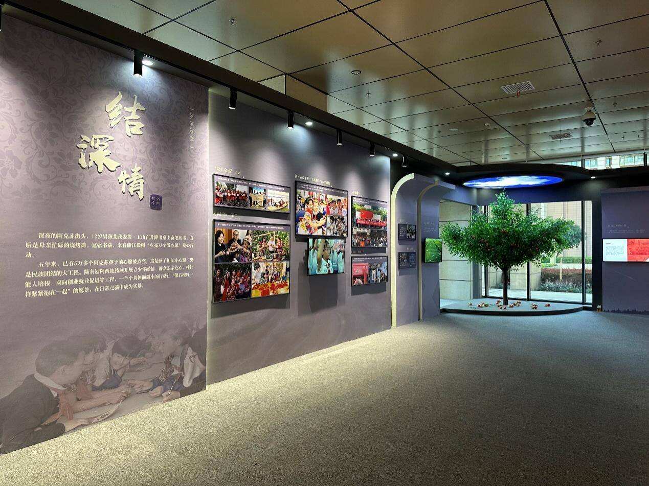 “惠民生”的温情空间里,记录了为800余名听障儿童重启世界的“启明行动”,陈列了在“千万工程在阿克苏”中焕新的农家小院模型,还有娜扎开提·约尔开提戴上人工耳蜗后喊出“妈妈”的录音。“润同心”篇章的文化长廊中,“石榴籽”青少年研学营的照片定格了一张张笑脸,小百花越剧团的戏服留下了曼妙的舞姿,兵团第一师图书馆中的沁人书香仿佛穿越千里感染了钱塘江畔的浙江儿女……静静的展厅,滚烫的故事,诉说着戈壁变新城的奇迹、平凡人变追梦人的感动。山海虽远,心若相连,就能共绘出最壮阔的时代画卷。