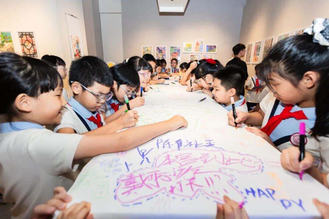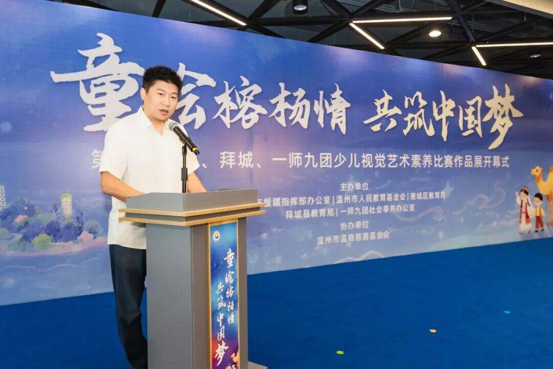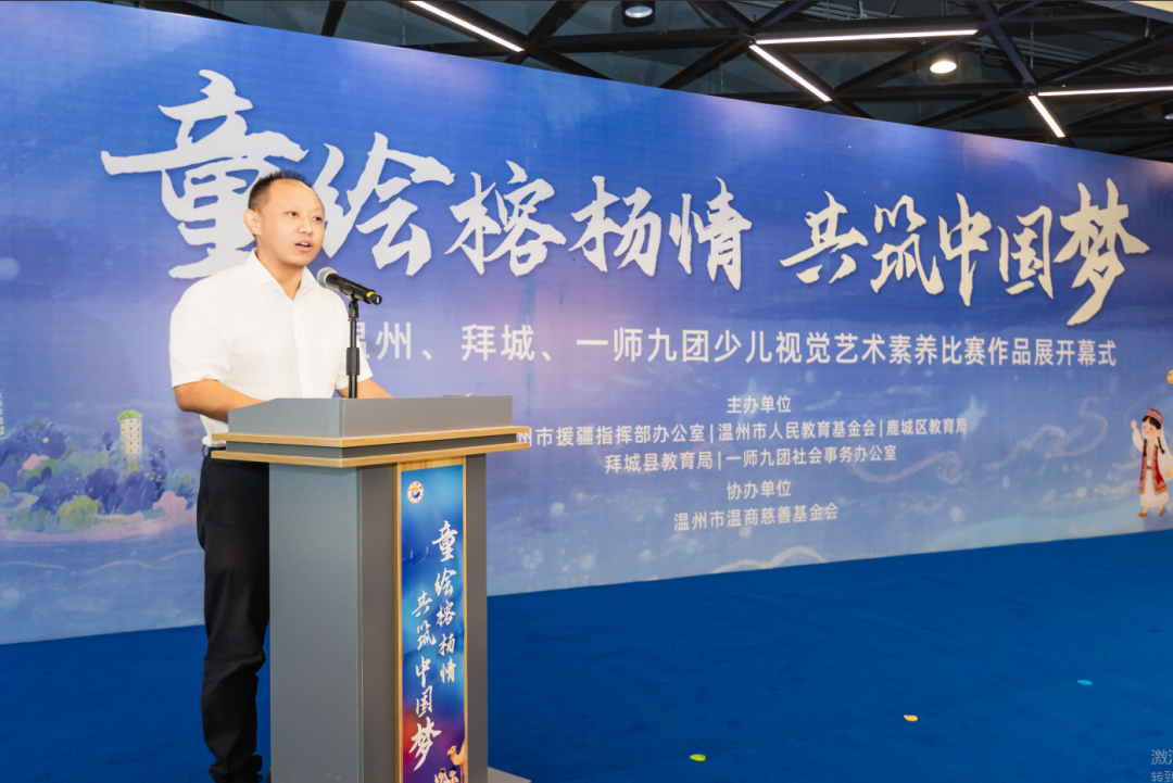 温州援疆指挥部处长李迅、温州市教育局人事处副处长丁林东、鹿城区教育局副局长吴万方、温州市人民教育基金会秘书长赵坚琳、鹿城区体卫艺科科长林克洪、温州市温商慈善基金会主任葛建海等领导共同为本次视觉艺术素养比赛作品展揭幕。展览涵盖美术、书法、摄影三大类别,作品色彩明快、风格质朴,充分展现了少年儿童天马行空的创造力,也成为三地文化互鉴、情感相连的温暖见证。