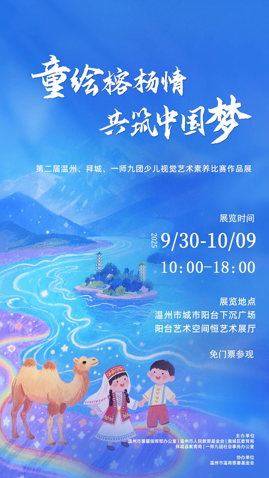据悉,本次展览涵盖美术、书法以及摄影等门类,即日起至10月9号在温州城市阳台艺术中心向公众开放,后续将在拜城县和一师九团各学校巡回展览。此次活动为三地青少年搭建了以艺会友的平台,进一步推动了温州与新疆在文化与美育领域的资源共享与融合发展。