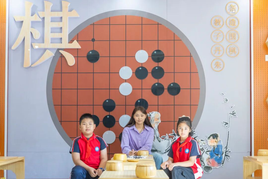 在校园里,围棋元素更是比比皆是:教学楼前“一座最有礼的学校”石碑旁,是去年刚建成的围棋广场,“有时候孩子们会在石制棋盘旁,以黑白石子对弈。”