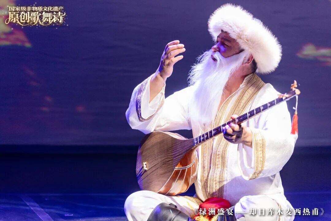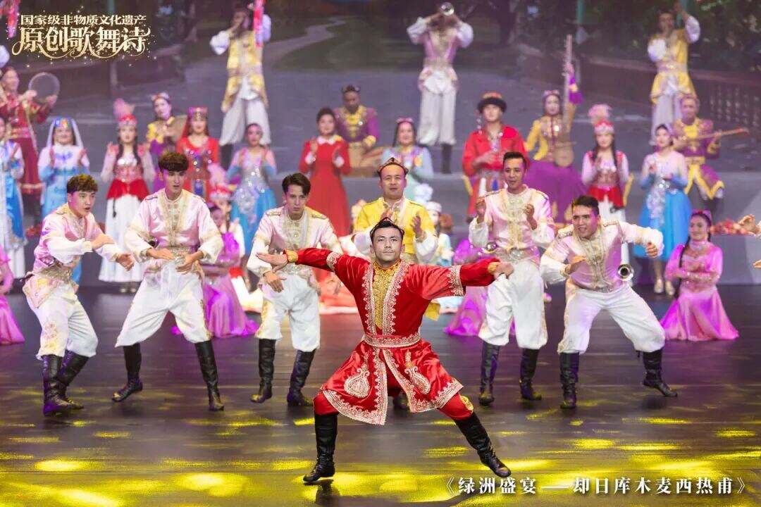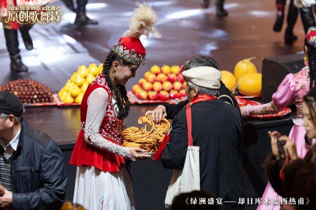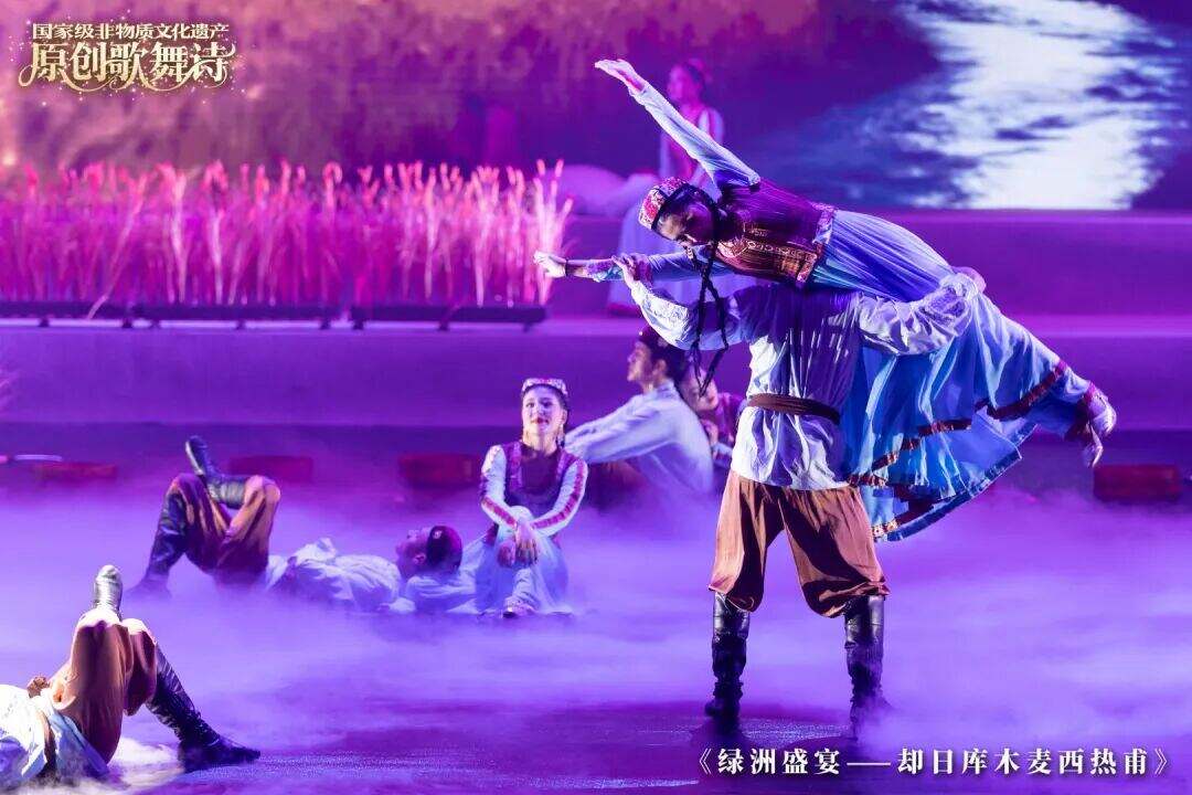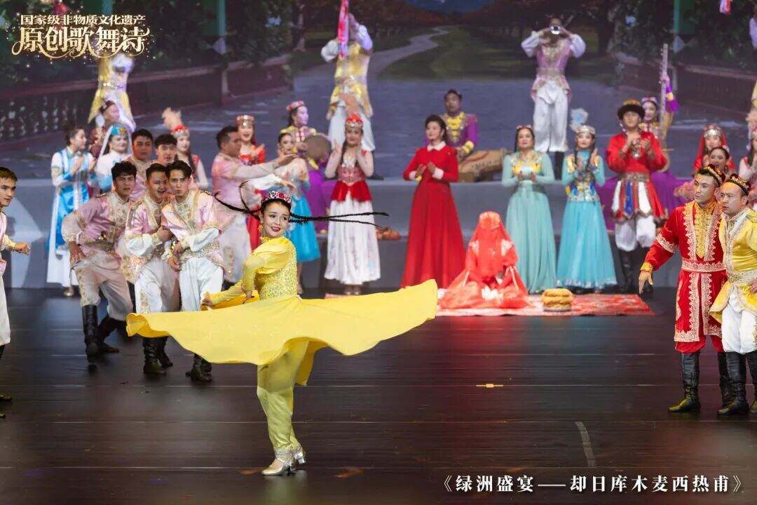 舞台上,故事徐徐展开:沙漠绿洲中的无限生机,却日库木人丰收时的喜悦,以及婚礼上各民族文化相融的多彩画卷。