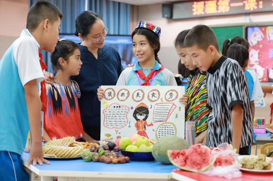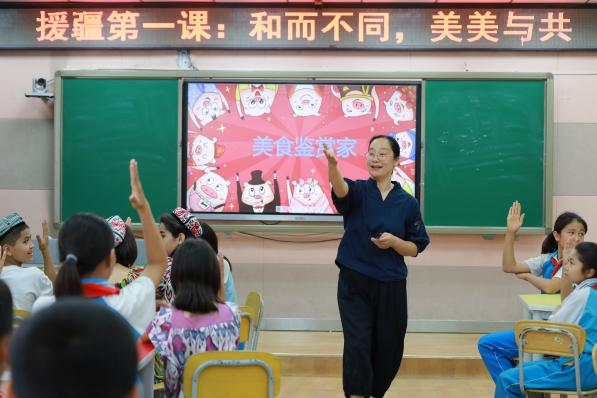 进疆第三天,她就接到了上好“援疆第一课”的任务。她多番考量,选取孩子们最喜闻乐见的美食作为题材,与绍兴塔山小学周俞萍老师一起呈现了一节别开生面的“绍阿一家亲,共享云美食”云端道法课,受到徒弟们的欢迎和好评。自此,在完成自己各类授课的前提下,为充分发挥专业带动、示范作用,她与多位年轻教师结成青蓝对子,通过磨课、听评课等形式,给予专业指导。