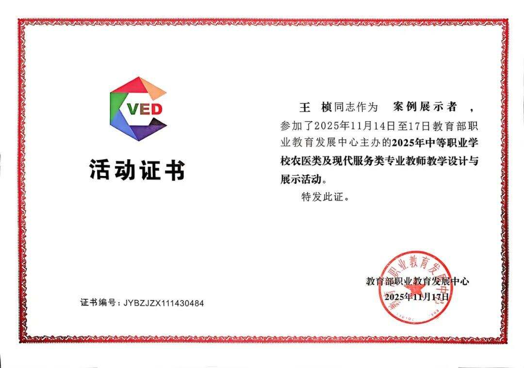 近日,由教育部职业教育发展中心主办的2025年全国中等职业学校农医类及现代服务类专业教师教学设计与展示活动在湖南省株洲市举行。阿克苏地区库车中等职业技术学校教师、“青蓝工程”学员王桢在结对师傅——宁波援疆教师宁香香的教导下,凭借扎实教学功底、新颖教学设计和出色现场表现,代表自治区医药卫生类学科获得典型案例展示者称号。