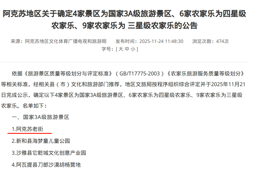 近日,阿克苏地区文化和旅游部门发布公告,正式确定阿克苏老街等4家景区为国家3A级旅游景区。经过系统化改造提升,阿克苏老街以崭新面貌和更完善的服务通过评审,成为当地文旅融合发展的一张新名片。