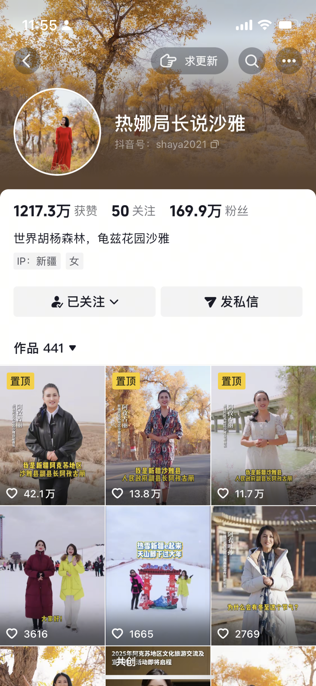 “热娜局长说沙雅”抖音账号自2021年10月开通以来,发布了441条推介沙雅县的视频,累计获赞1217.3万,拥有超过169.9万粉丝,账号通过沉浸式体验和亲切讲述,将沙雅的胡杨林海、塔里木河风情以及特色美食生动呈现在网友面前,有效带动了沙雅旅游经济的发展。