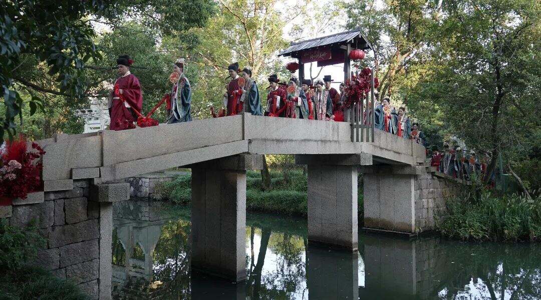 “敬,日月星辰;允,长相厮守……”8月29日,七夕节,在杭州西溪国家湿地公园,15对身着华美宋制婚服的新人一起许下爱的誓言,进行了一场特殊的集体婚礼。