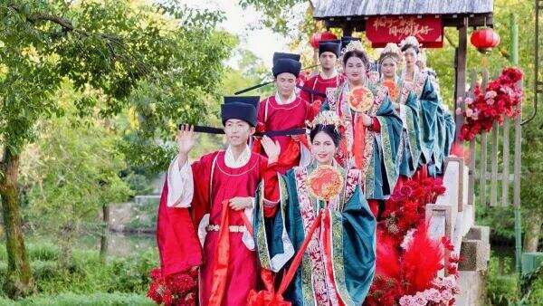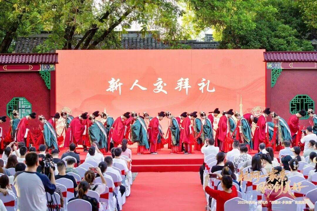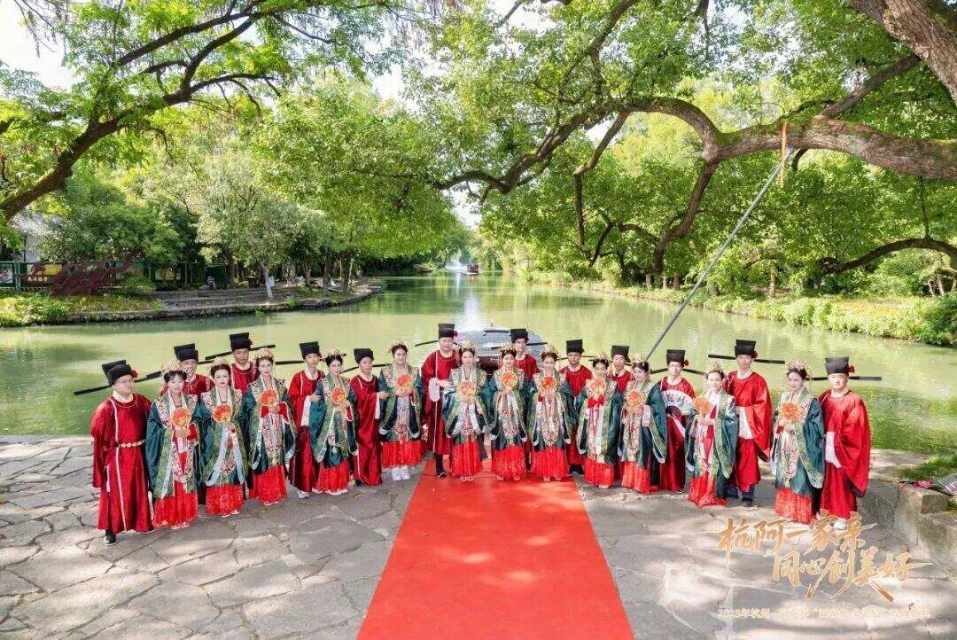 仪式前,新人们还体验了别具特色的水上迎亲环节,在西溪湿地如诗如画的美景中,感受了杭州作为历史文化名城的独特韵味。后续,远道而来的阿克苏新人还将前往良渚博物院、杭州亚运会博物馆等地参观,游览西湖胜景,领略杭州的城市风貌和创新活力。