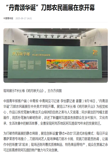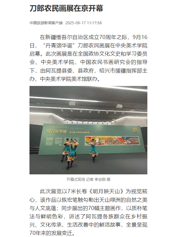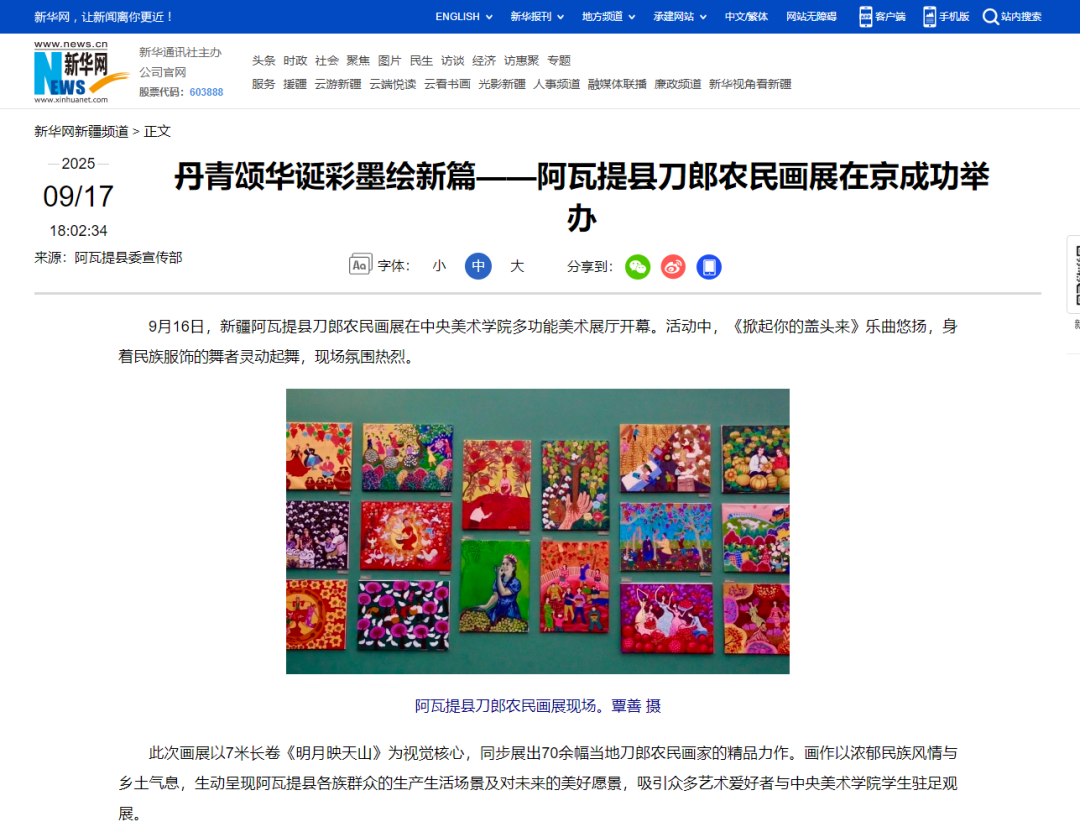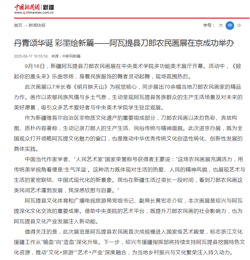 9月16日,由中共阿瓦提县委、阿瓦提县人民政府、绍兴市援疆指挥部主办的“丹青颂华诞”刀郎农民画展在北京中央美术学院盛大开幕,70幅画作惊艳亮相,新华网、中国日报、中国日报国际版、中国旅游新闻客户端、中国青年报、中国新闻网等多家中央媒体第一时间聚焦报道,让边疆民间艺术的魅力透过镜头传遍全国。