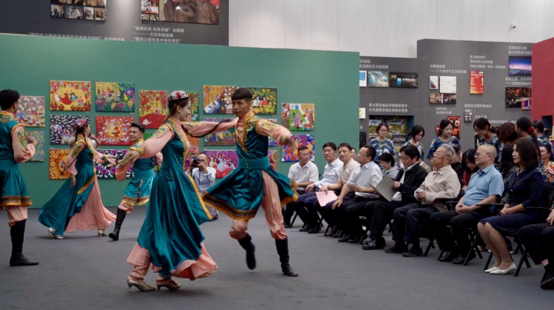 开幕式上,《掀起你的盖头来》乐曲悠扬,身着民族服饰的舞者灵动起舞,现场氛围热烈;全国政协文化文史和学习委员会、中央美术学院、中国农民书画研究会及阿瓦提县、绍兴市援疆指挥部相关领导与各界嘉宾出席,展览彰显文化援疆成果。