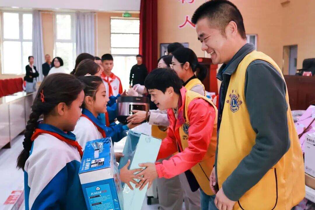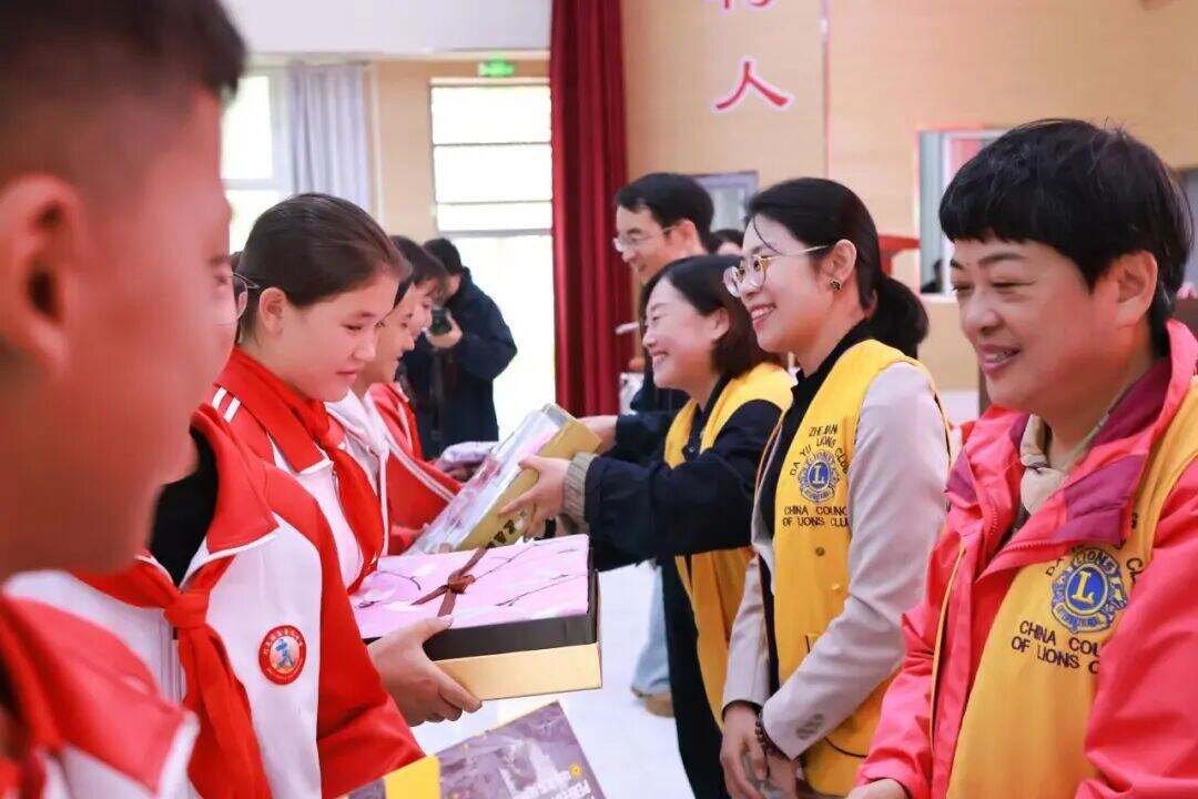 在充满感动的捐赠环节,主席台领导分两批向16名学生代表颁发了承载着浙江人民深厚情谊的“微心愿”礼物。孩子们接过礼物时那灿烂的笑脸和闪亮的眼眸,成为了此刻最温暖的画面。随后,阿瓦提县教育局党组书记、副局长郭超代表阿瓦提县教育系统和广大受助学子,向中国狮子联会浙江大禹服务队和浙江省慈善义工协会大脚印团队赠送锦旗,以此表达对浙江爱心团队慷慨义举的诚挚谢意和崇高敬意。