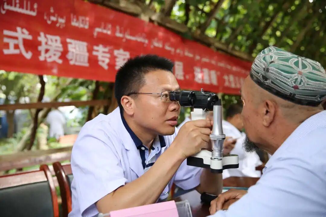 在健康报《送医送药到南疆》的报道中,那张他为维吾尔族老人检查眼睛的照片,感动了无数读者。