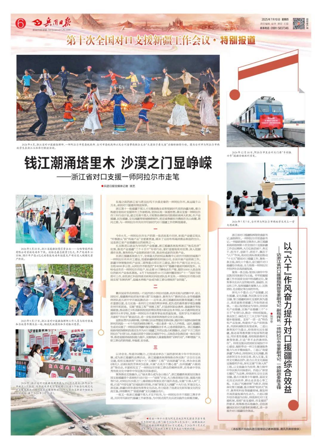 浙江省援疆指挥部党委副书记、副指挥长,一师党委副书记、副政委,一级巡视员陈玉锋表示,浙江援疆系统将认真贯彻第十次全国对口支援新疆工作会议精神,大力弘扬忠诚干、务实干、担当干、创新干、团结干、廉洁干“六干”作风,高站位高标准谋划推动“十五五”期间对口援疆工作,聚焦一条主线,深化六个重点,奋力提升对口援疆综合效益,全力助推一师阿拉尔市经济社会高质量发展。