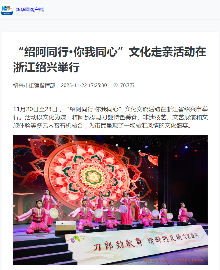 为深入贯彻落实第十次全国对口支援新疆工作会议精神,深化绍阿两地文商旅融合发展,促进交往交流交融,进一步铸牢中华民族共同体意识,11月20日至23日,由绍兴市援疆指挥部与阿瓦提县共同打造的“绍阿同行·你我同心”文化走亲活动在绍兴成功举办。