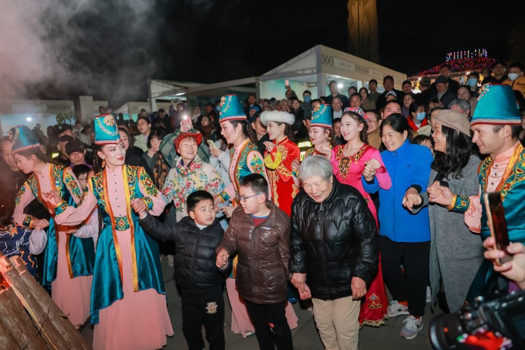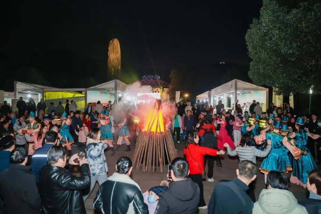 绍兴市、阿瓦提县及一师七团有关领导共同出席启动仪式,与现场群众一道见证了这场跨越山海的文化盛会。绍阿两地艺术家联袂献演,以舞蹈《鼓动青春》点燃全场,戏曲连唱《梨园锦绣》展现江南韵味,舞蹈《丝路棉语》《慕萨莱思之恋》《胡杨苍韵》《刀郎舞韵》则携着大漠的豪迈与苍茫,与江南的温婉韵致交织成一幅多元文化交融的生动画卷。音诗画《月光下的中国》、乐器弹唱《朱拉巴亚宛木卡姆》更以艺术语言诠释了中华民族共同体意识的内涵。活动现场,阿瓦提县通过文旅推介全方位展示了当地自然风光与民俗文化,为推动两地文旅协作开辟新空间。篝火晚会上,两地民众围火共舞的温馨场景,让绍阿温情溢满古城冬夜。