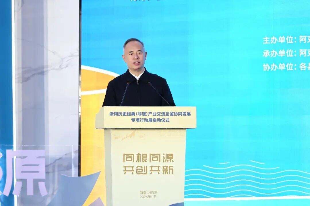 11月27日,由阿克苏地区行署、浙江省援疆指挥部、浙江省文投集团联合主办的“浙阿历史经典(非遗)产业交流互鉴协同发展专项行动展”在阿克苏地区城市规划馆隆重开幕。阿克苏地委书记吴红展,自治区文旅厅党组成员、副厅长马旭国,阿克苏地委副书记、浙江省援疆指挥部党委书记、指挥长骆梅英,浙江省文投集团党委副书记、总经理蒋国兴,阿克苏地区行署副专员、浙江省援疆指挥部副指挥长、一级巡视员朱磊等领导,及非遗传承人、青年代表、媒体记者等共同出席启动仪式。