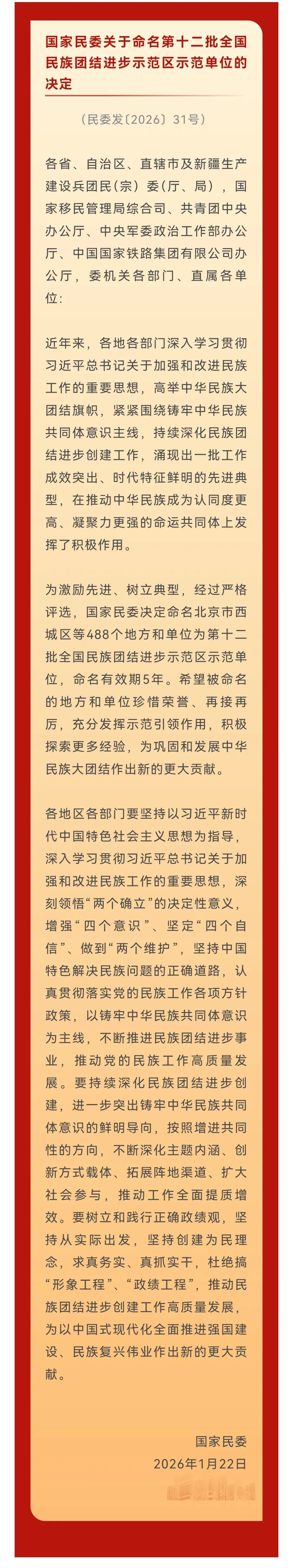 1月22日,国家民委印发《关于命名第十二批全国民族团结进步示范区示范单位的决定》,其中浙江省援疆指挥部被命名为全国民族团结进步示范单位。